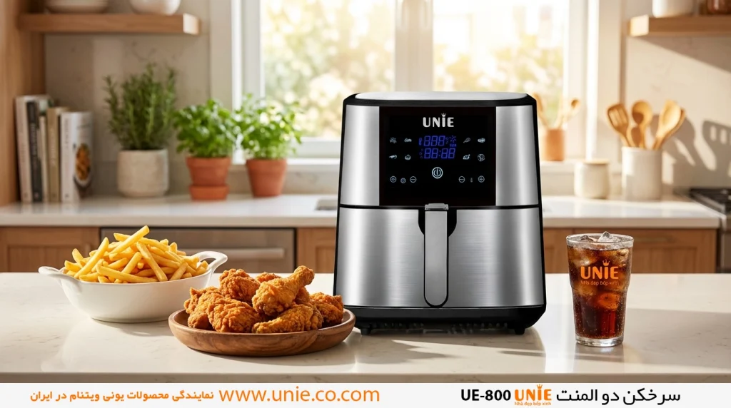 اگر به دنبال خرید یک سرخکن بدون روغن حرفهای، بادوام و سالم هستید، سرخکن یونی UE-800 عرضهشده توسط فروشگاه لوازم خانگی برقی ام اچ کالا میتواند گزینهای ایدهآل برای شما باشد. این سرخکن دو المنت یونی با ترکیب فناوری، طراحی زیبا و عملکرد قدرتمند، تجربهای نوین از آشپزی سالم و مدرن را به خانه شما میآورد و لذت طعم غذاهای ترد، خوشپخت و کمچرب را دوچندان میکند. این یعنی میتونی انواع غذا مثل سیبزمینی سرخکرده، مرغ، گوشت، استیک، سبزیجات و حتی غذاهای رژیمی رو باهاش درست کنی. مشخصات فنی سرخکن بدون روغن یونی UE-800 مدل: UE-800 برند: UNIE نوع دستگاه: سرخکن بدون روغن (Air Fryer) ظرفیت: ۸ لیتر توان مصرفی: ۱۸۰۰ وات فناوری پخت: Rapid Air (گردش هوای داغ) کنترل: پنل لمسی LED دامنه دما: ۸۰ تا ۲۰۰ درجه سانتیگراد سبد: جداشونده و قابل شستوشو اقلام جانبی: سبد سرخکردن، سینی جمعآوری روغن، سینی پخت گارانتی: گارانتی معتبر رادوین سرویس جایگاه سرخکن یونی UE-800 در وبسایت UNIE وبسایت UNIE ایران بهعنوان مرجع رسمی معرفی محصولات این برند فعالیت میکنه و نمایندگی فروش مستقیم محسوب نمیشه. اطلاعاتی که درباره سرخکن یونی UE-800 ارائه شده، با هدف آگاهیرسانی شفاف و دقیق برای مصرفکنندهها و فعالان بازار تهیه شده. گارانتی و خدمات پس از فروش سرخکن بدون روغن یونی مدل UE-800 با گارانتی معتبر رادوین سرویس عرضه میشه. این گارانتی شامل خدمات پس از فروش و پشتیبانی فنی طبق قوانین شرکت گارانتیکنندهست تا با خیال راحت از دستگاه استفاده کنی.