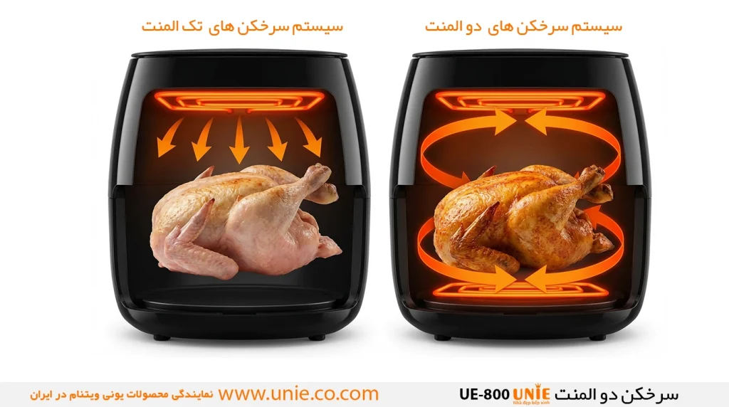 یکی از مهمترین نقاط قوت این دستگاه، بهرهمندی از دو المنت حرارتی در بخش بالا و پایین است؛ ویژگیای که سرخکن UE-800 را در دسته سرخکنهای دو المنت یونی قرار میدهد. این ساختار پیشرفته، در کنار فناوری گردش هوای توربو ۳۶۰ درجه، موجب توزیع یکنواخت حرارت در فضای داخلی دستگاه میشود. نتیجه این فرآیند، پخت یکدست غذا با بافتی ترد در سطح بیرونی و مغزپخت در بخش داخلی است، آن هم با حداقل میزان مصرف روغن.